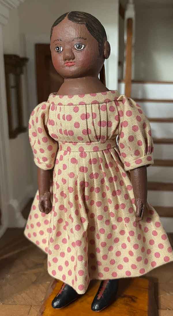 She wears a pink polka dot dress, her boots have red laces